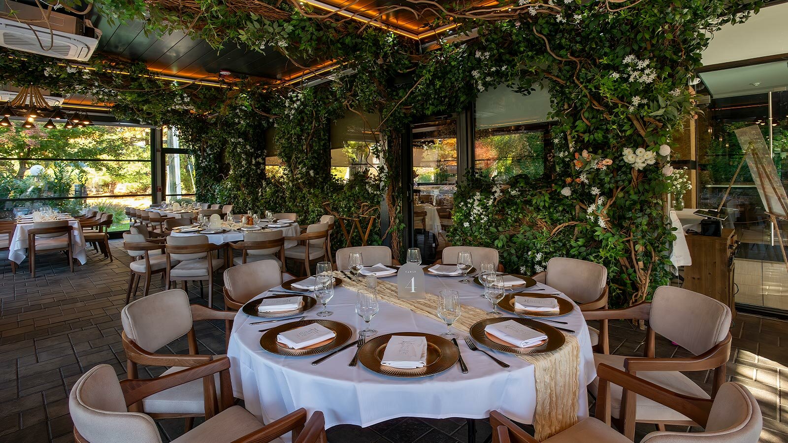 Surrounded on all sides by glass and windows. Perfect room for corporate meetings. family dinner or any kind of gathering under 40 guests.